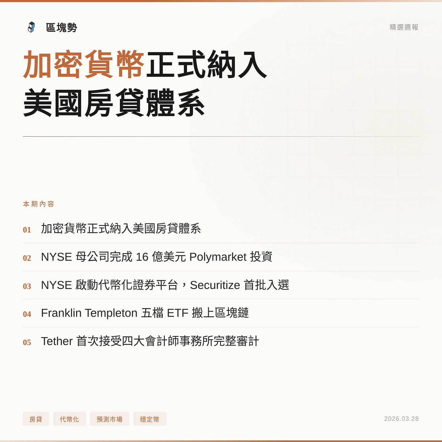 ICE 加碼投資 Polymarket、NYSE 啟動證券代幣化平台、富蘭克林坦伯頓把 ETF 搬上鏈、Tether 首度接受四大會計師事務所審計