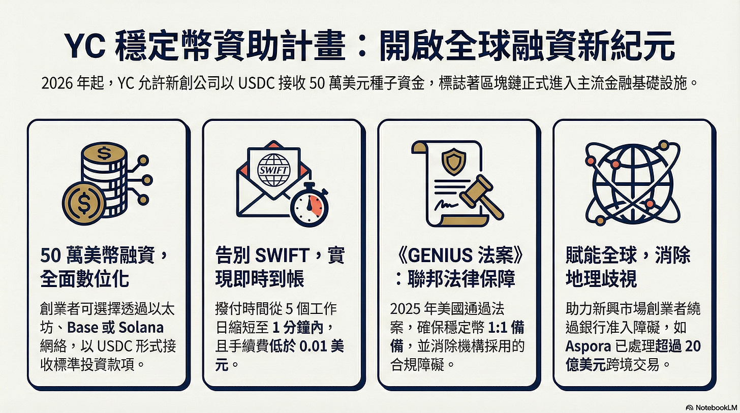 Y Combinator(YC)宣布,自 2026 年春季梯次起,入選新創可選擇用 USDC 穩定幣領取標準 50 萬美元投資款,撥款網路支援以太坊、Base 與 Solana;這代表創投從過去只能走銀行電匯的流程,開始把「發錢」當成可直接在鏈上結算的金融基礎設施。