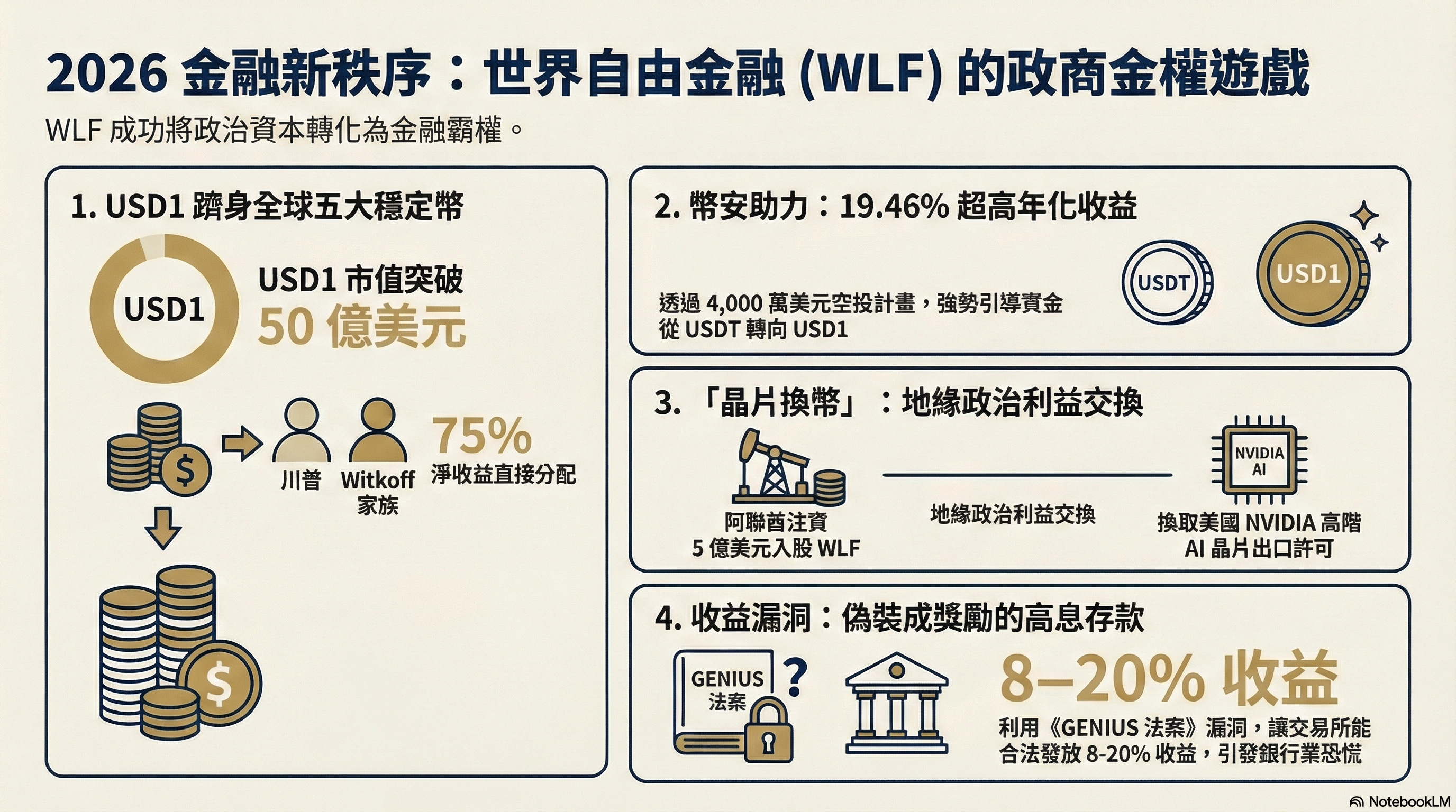 川普在 2025 年就職前夕,WLF 獲得阿聯酋投資方約 5 億美元入股。同年 3 月阿聯酋資本再向幣安投資 20 億美元,並以 USD1 作為結算資產。隨後美國政府於 2025 年 5 月批准向阿聯酋出口 50 萬顆 NVIDIA AI 晶片,並在 10 月特赦幣安創辦人趙長鵬。這一連串時間點接近的事件使外界質疑存在政治與商業利益交換。批評者指出,在實際支付與商業使用仍有限的情況下,USD1 仍能憑藉交易所導流與政治資本支持快速累積市值,顯示其價格與規模可能高度依賴權力結構與資金配置,而非真實市場需求。