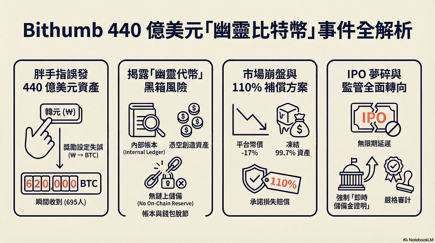 韓國第二大交易所 Bithumb 在執行行銷活動時因內部設定錯誤,原本應發放 2,000 至 50,000 韓元的獎勵金,誤以比特幣為單位發出,導致系統向 695 名用戶錯誤發出約 620,000 枚比特幣。按當時每枚約 71,000 美元計算,總值約 440 億美元。部分用戶嘗試拋售與提領,造成平台內比特幣價格一度與全球行情脫鉤。Bithumb 隨即凍結帳戶並暫停交易,事件也暴露出中心化交易所帳本可生成超出實際持有量資產的內控缺口。