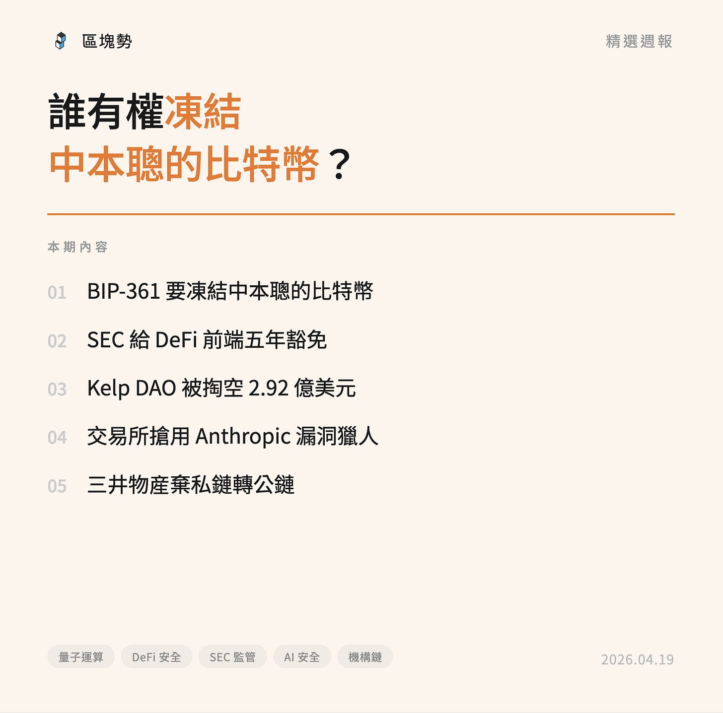 中本聰的比特幣恐遭凍結DeFi 豁免登記經紀商、Kelp DAO 遭駭近 3 億美元、三井物産棄私鏈轉公鏈、交易所搶著要 MythosApr 19, 2026∙ Paid3ShareThis post is for paid subscribersSubscribeAlready a paid subscriber? Sign in