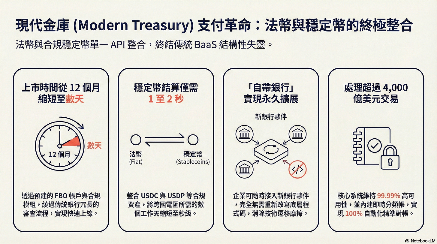 過去企業若要新增支付方式,通常需要與銀行談判數月、調整系統架構,甚至更換基礎設施。Modern Treasury 現在讓企業在幾天內啟用新支付路由,並可在後台切換不同金流通道,而不必重寫底層系統。顯示企業支付基礎設施正在從單一銀行主導,轉向由科技平台整合多種資金軌道。