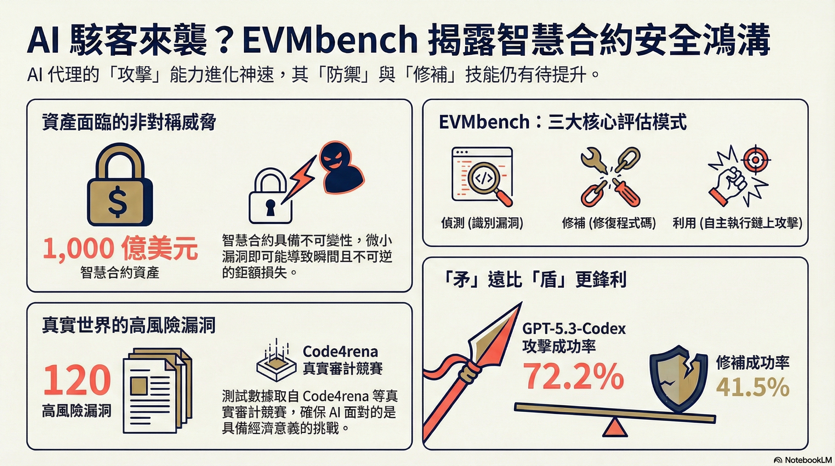 OpenAI 與加密投資公司 Paradigm 近日發布開源測試工具 EVMbench,用來評估人工智慧模型在以太坊智慧合約上的三種能力:找漏洞、修漏洞、以及實際發動攻擊。目前區塊鏈上的穩定幣市值已經超過 3,000 億美元。智慧合約一旦部署便難以修改,錯誤可能在短時間內造成重大資金損失。EVMbench 的目的是量化 AI 在真實金融場景中的攻防能力。它收錄 120 個高風險漏洞,並在模擬鏈上環境中測試多款頂尖模型的實際表現。