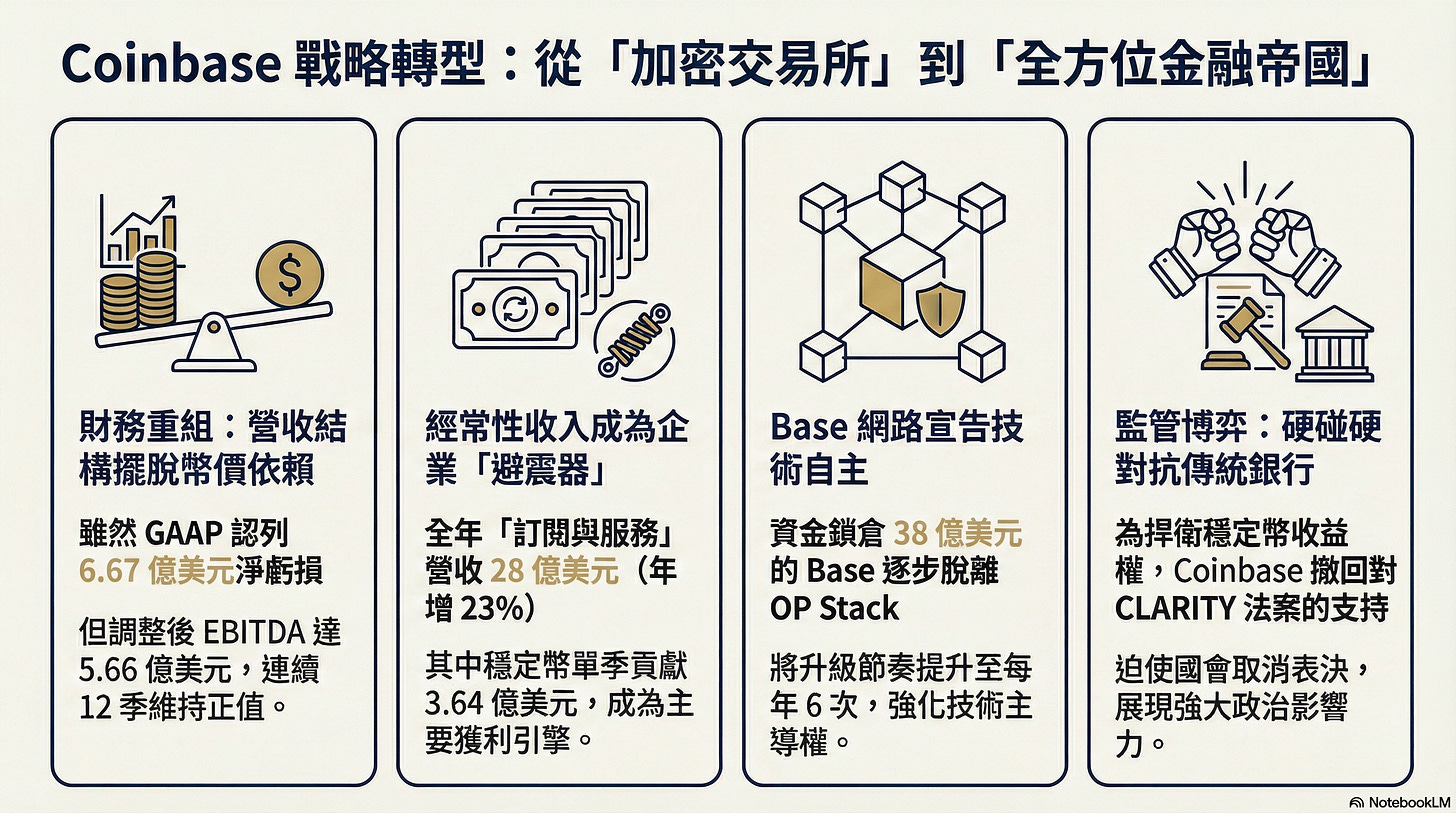 美國最大加密交易所 Coinbase 公布 2025 年第四季財報,營收年減 22%、認列 6.67 億美元 GAAP 淨虧損,股價一度下探至 140 美元附近;但虧損主要來自資產未實現損失。排除一次性因素後,當季調整後 EBITDA 仍達 5.66 億美元,全年「訂閱與服務」營收 28 億美元、年增 23%,其中穩定幣相關收入單季 3.64 億美元。這代表 Coinbase 已清楚意識到,單靠交易手續費無法支撐長期估值,公司正把重心轉向穩定幣與經常性收入,試圖擺脫與幣價高度綁定的舊模式。