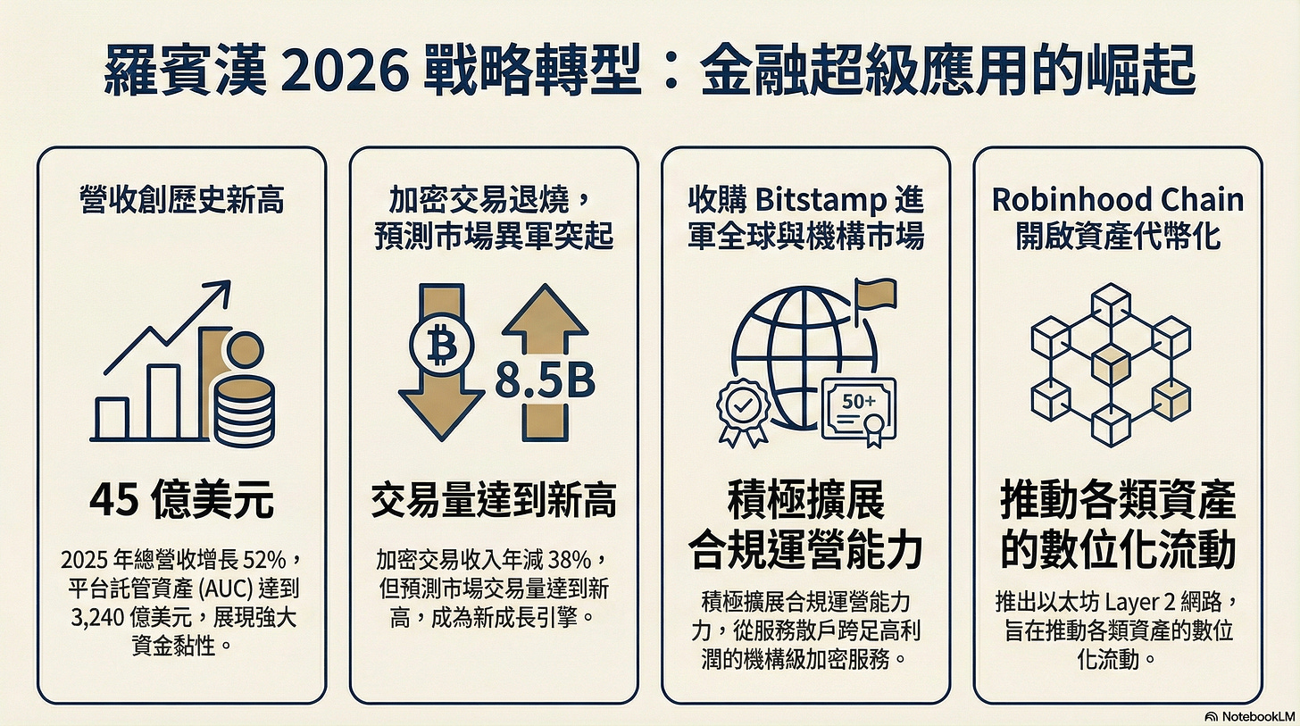 Robinhood 在 2025 年第四季財報中呈現明確轉向。加密貨幣市場於 2025 年底回檔、平台加密交易收入下滑的情況下,公司營運重心轉為透過預測市場、選擇權與利息收入維持散戶在 App 內的交易活躍度。這代表其策略從「押加密牛市」,轉為「經營散戶金融生態系」。