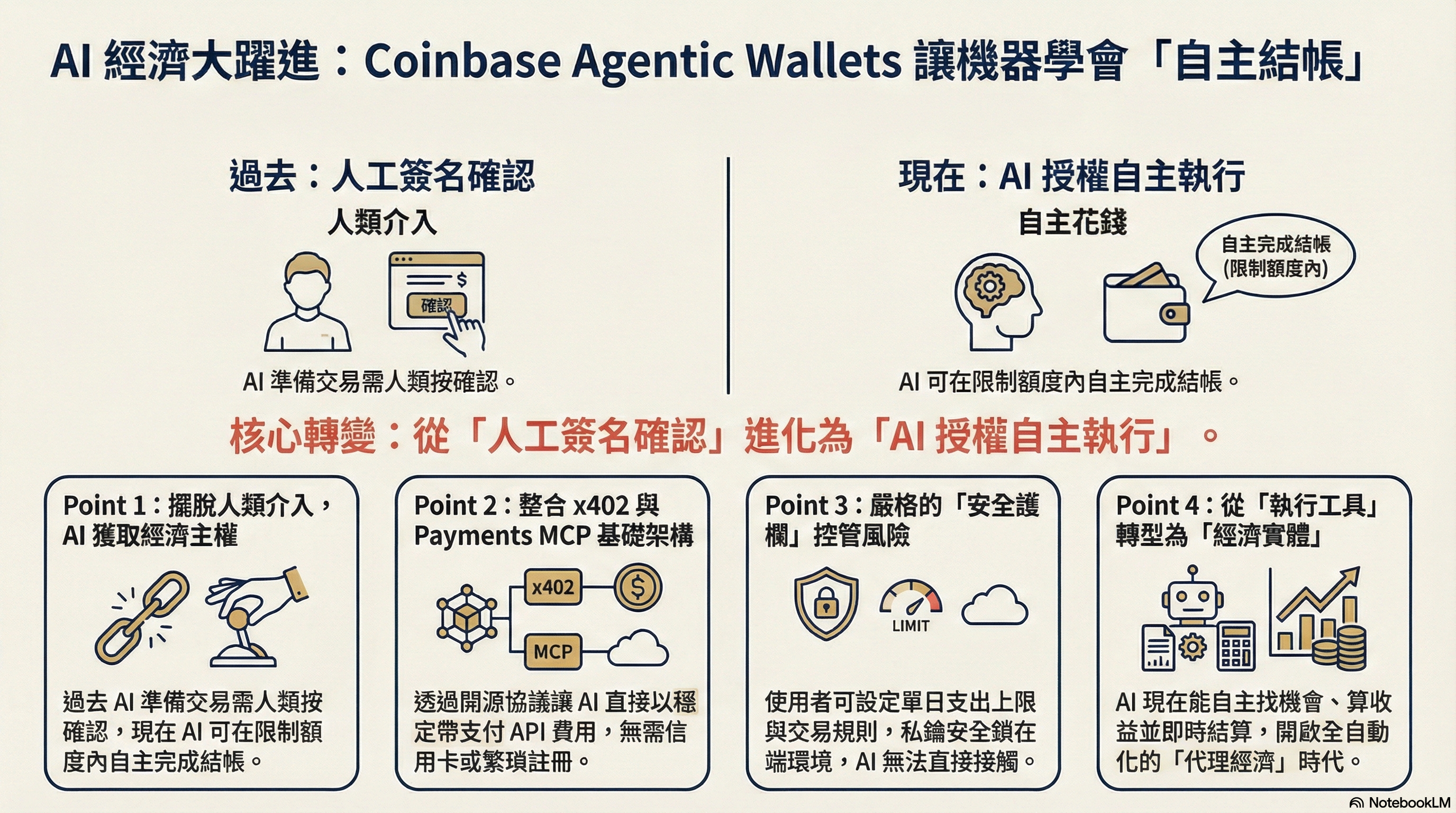 Coinbase 推出「代理錢包(Agentic Wallets)」。以前他們為 AI 打造的嵌入式錢包,其實還是「人類在管錢」。AI 可以幫你找機會、算收益、準備好交易,但真正轉帳或付款,一定要你自己按確認。這次的差別在於 Coinbase 讓 AI 在事先設定好的額度和規則內,可以自己花錢。也就是從「AI 建議、人類簽名」,變成「AI 在限制內自己完成交易」。